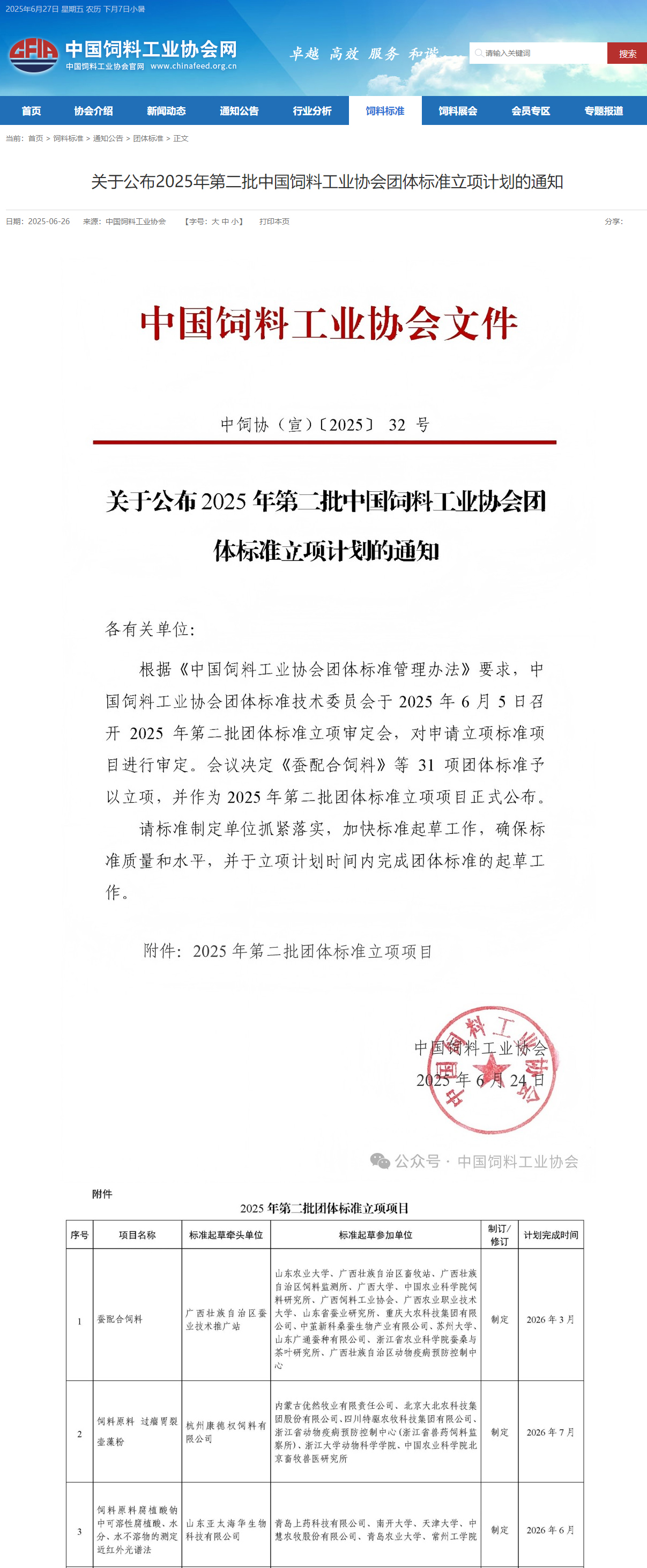 近日,中國飼料工業(yè)協(xié)會(huì )正式發(fā)布了《關(guān)于公布2025年第二批中國飼料工業(yè)協(xié)會(huì )團體標準立項計劃的通知》,由廣西壯族自治區蠶業(yè)技術(shù)推廣站牽頭,重慶大農科技集團有限公司、山東農業(yè)大學(xué)、廣西大學(xué)、蘇州大學(xué)、廣西壯族自治區畜牧站、中國農業(yè)科學(xué)院飼料研究所等14家單位共同參與起草的《蠶配合飼料》團體標準項目成功立項,并位列項目清單首位。這一標準的制定將填補蠶配合飼料領(lǐng)域的標準空白,為行業(yè)提供統一的技術(shù)規范,推動(dòng)蠶桑產(chǎn)業(yè)高質(zhì)量發(fā)展。